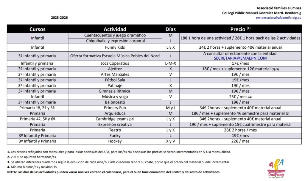 Horari de les activitats de 13:30h a 15h (dilluns i dimarts) y de 12:45 a 15h (dimecres, dijous i divendres). Per a més informació: inscripcionsextraescolars@afabenifaraig.es